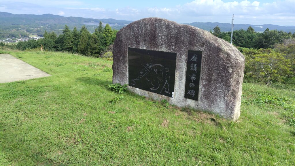 駐車場に車を止め、つつじの木が植えられた斜面を登っていくと頂上に座頭市の碑なるものが。座頭市は小説の主人公ですが、笠間出身という設定らしい。