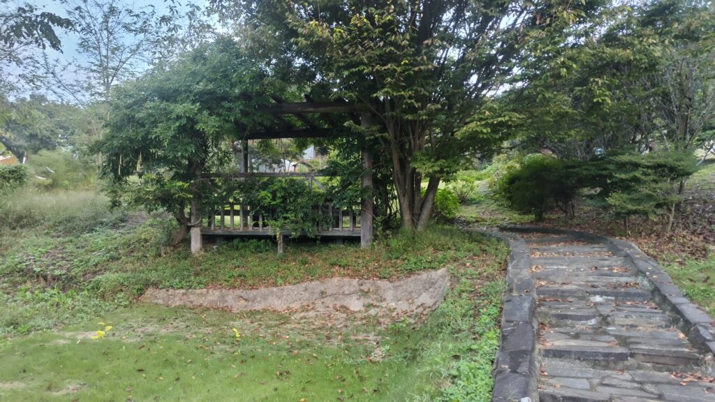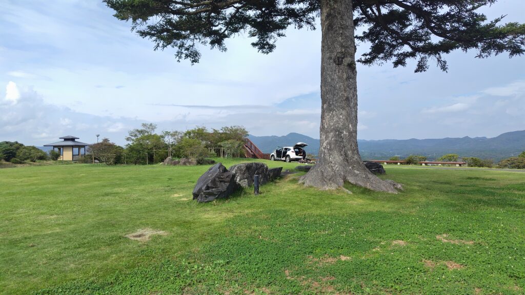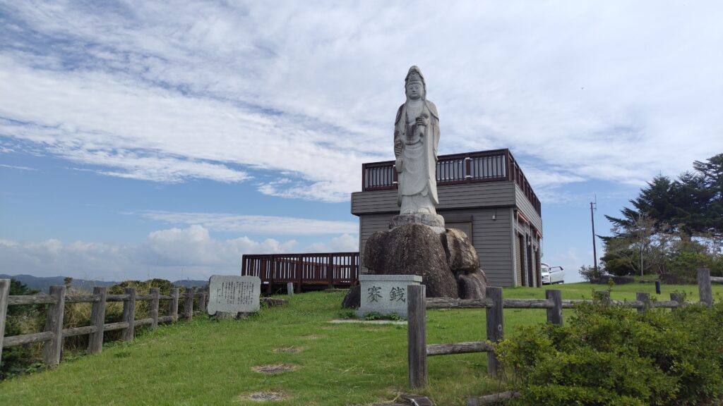 身代わり観音様。後ろの建物は展望台のようですが、件のキャンプ場利用者が近くにいるので上がりませんでした。(この写真だと、やはり芝生に乗り上げてるように見える)
