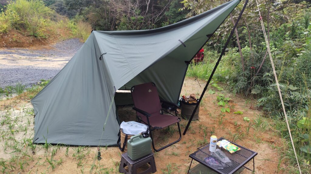 DDタープ3.5×3.5をビークティピーで設営。パスファインダーと悩んだのですが、それ程強く雨は降らないだろうという希望的観測からこの張り方を選択。