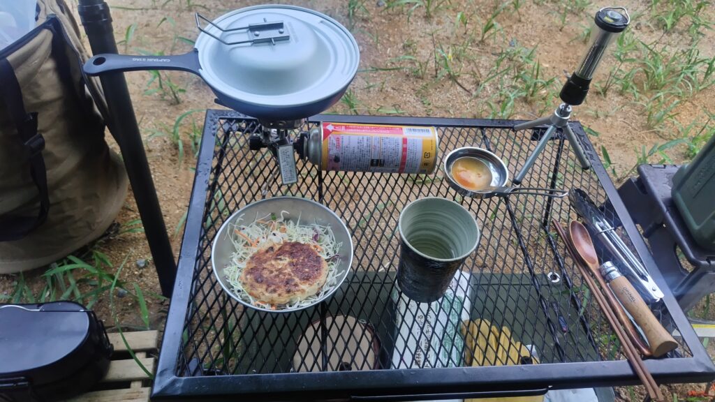 炊飯が終わったのでバーナーから飯盒を下ろし、偽スキレットに交換。おさかなハンバーグなるものを買ったので、表書きを参考に両面に焼き色を付けて食べる。