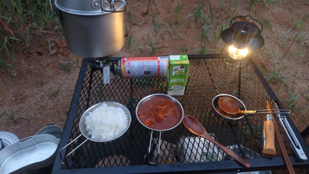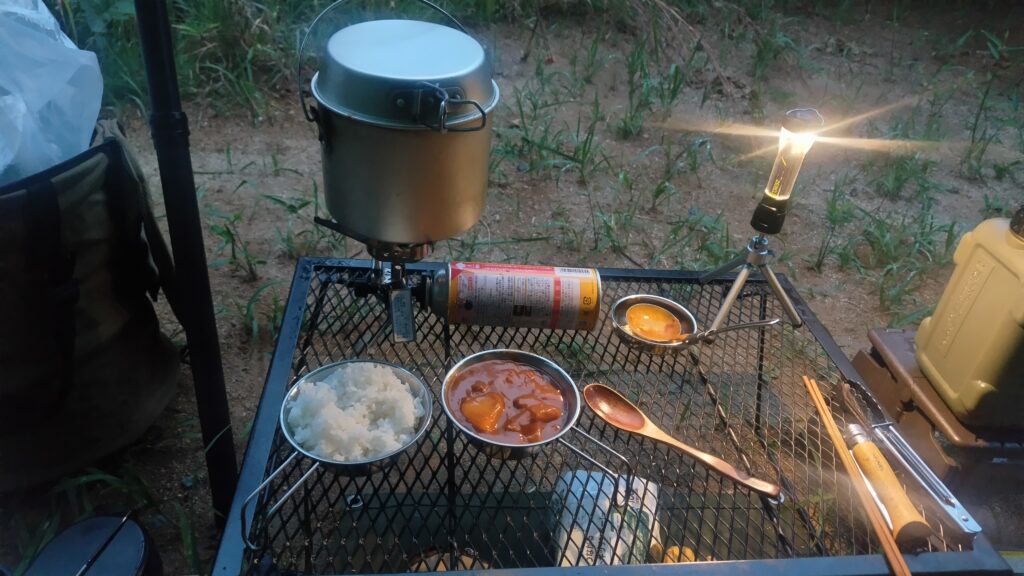 カレーを温めなおして締め。残したカレーと白米、食器類は車に収納。雨音を聞きながら幕内で過ごし、眠くなったところで就寝。