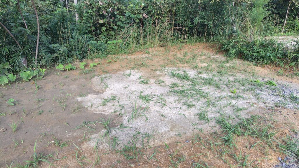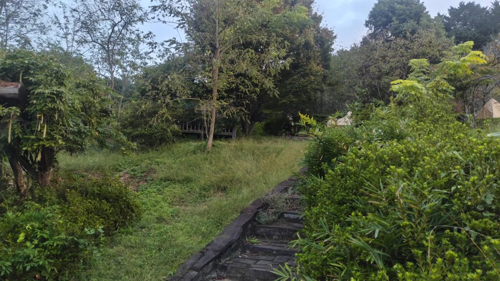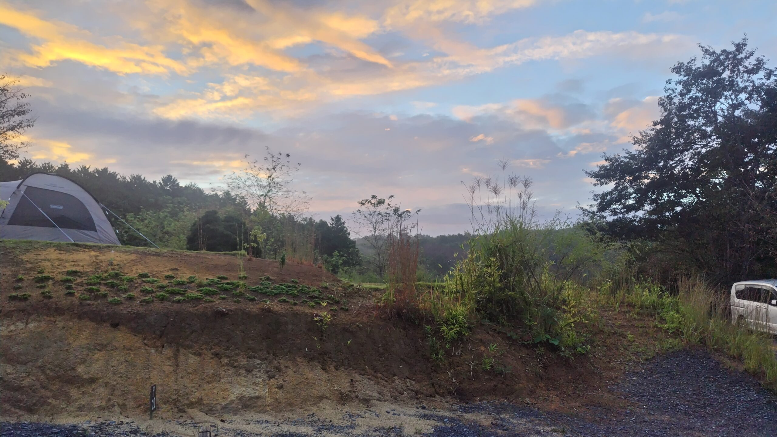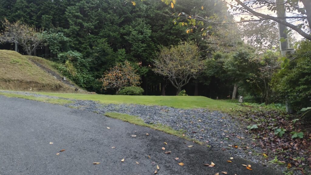 公園の駐車場から5分ほど車を走らせて沓吾郎キャンプさんに到着。いつもは管理棟近くの林の中に陣取るのですが、今回は気分を変えて入り口から見て左側の急坂の上に登ってみました。