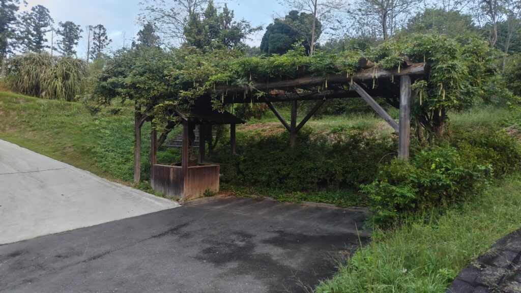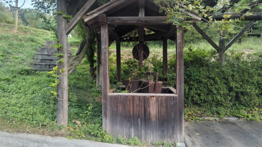 いつもここに来るたびに「入り口に何かあるなあ」と思っていたのですが、まじまじと観察するのは今回が初めて。一応、一時的な駐車スペースのようになっており、左の箱状のものはダミーの井戸です。