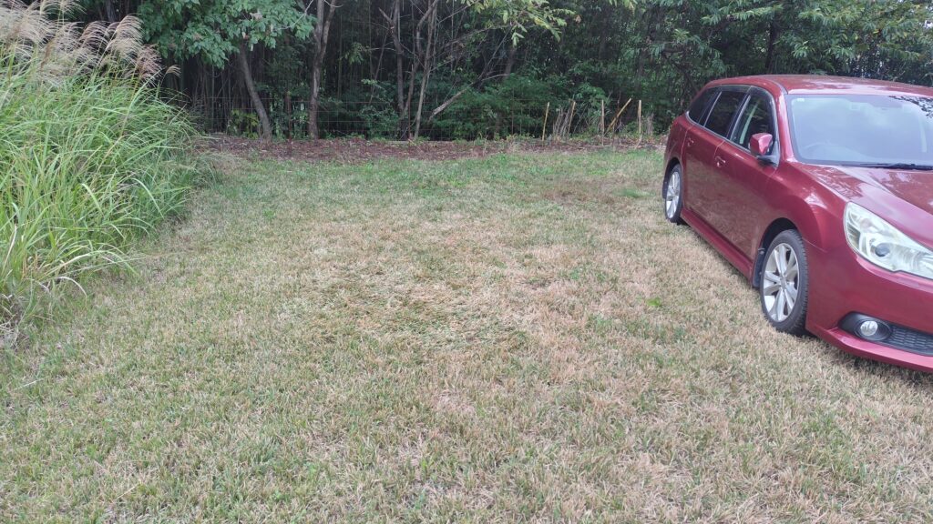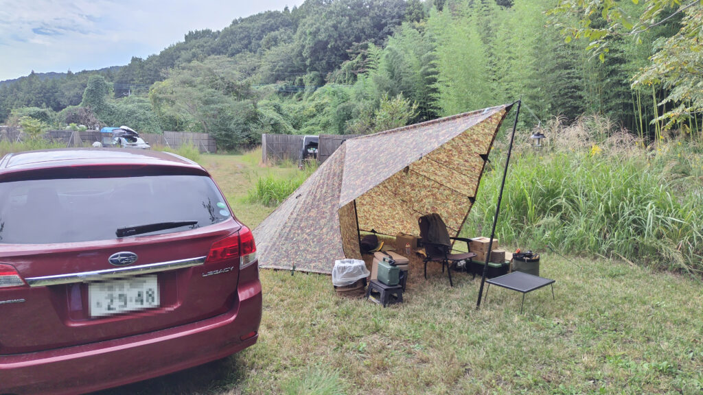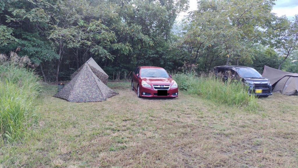 実のところ、このキャンプ場で隣に入られることはほとんど無かったのですが、今回は混雑ゆえにこのような配置に。一応、距離が取れるように低い草むら側に車を止めて設営しました。
