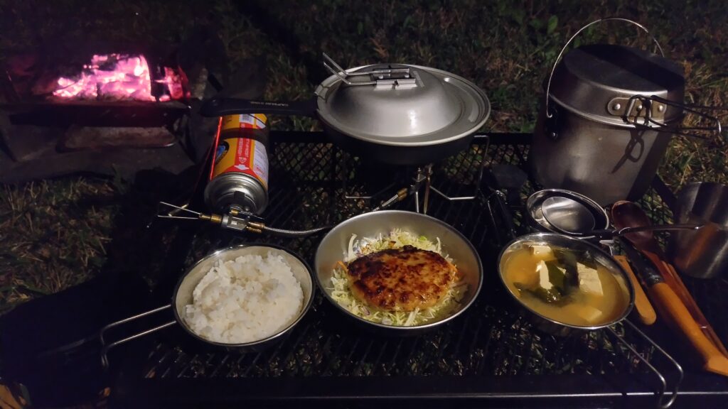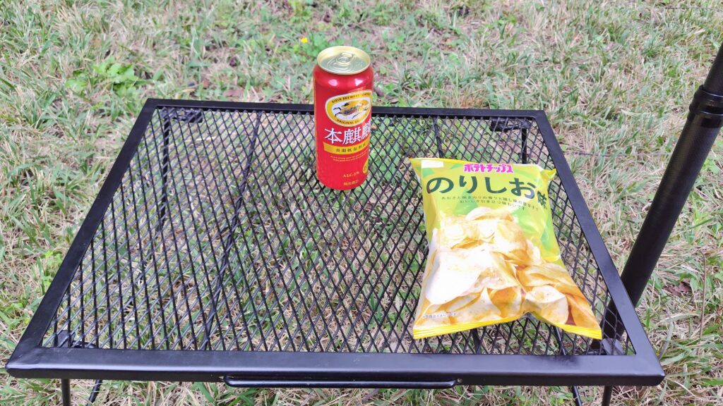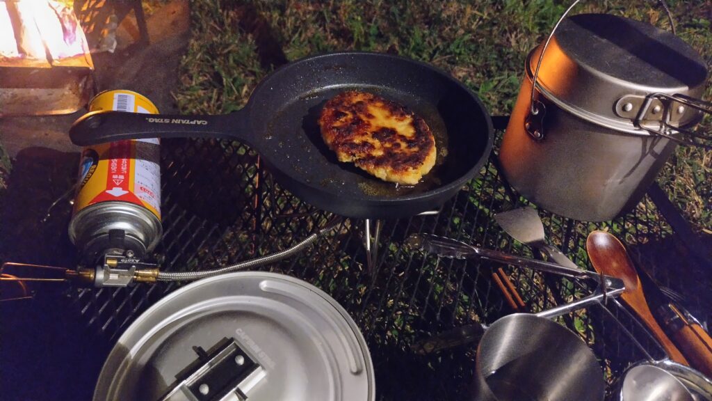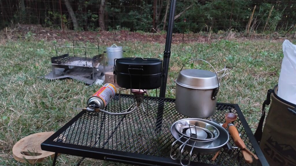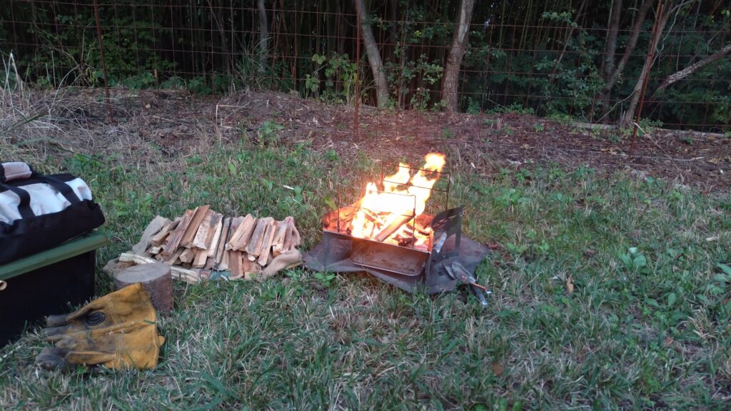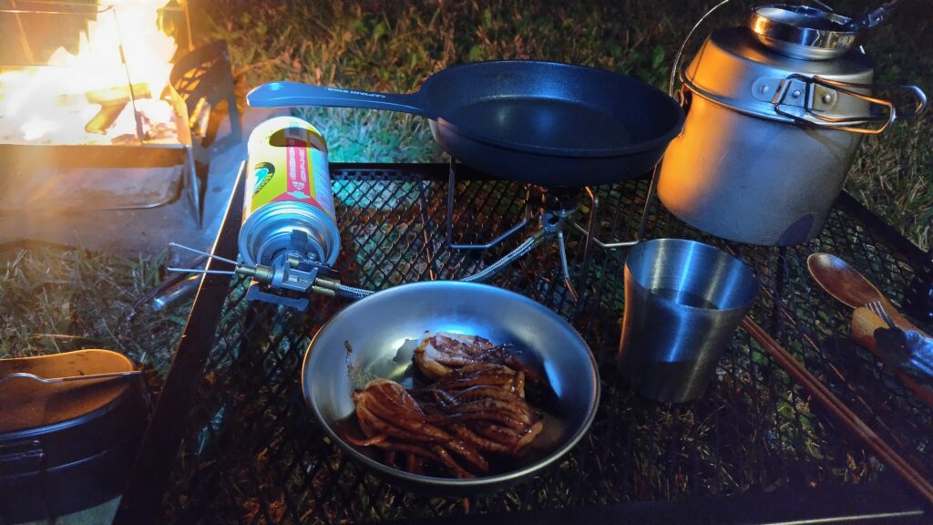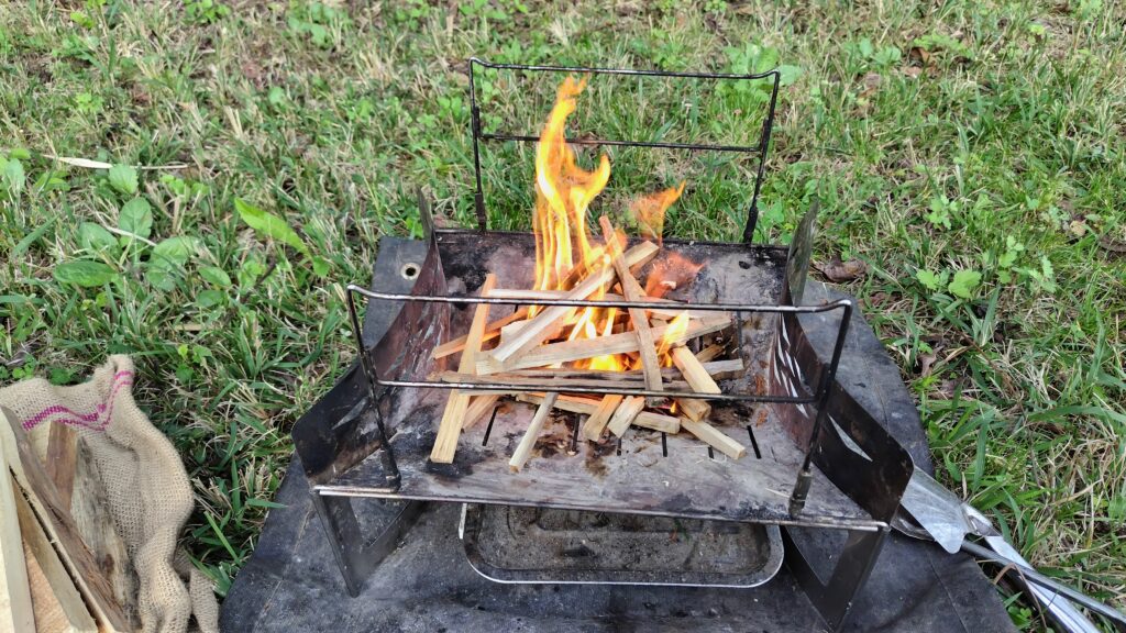 小割の薪を使っているため、燃え尽きるのも早い。様子を見ながら薪をくべているが、だんだん面倒になってきたのと、日が傾くにつれ気温も下がってきたのでテーブルの近くまで焚火台を移動しました。