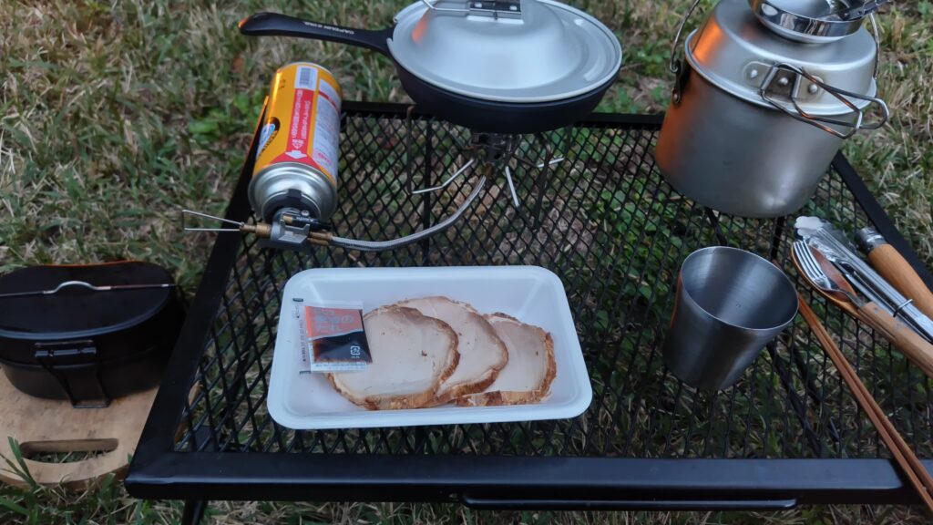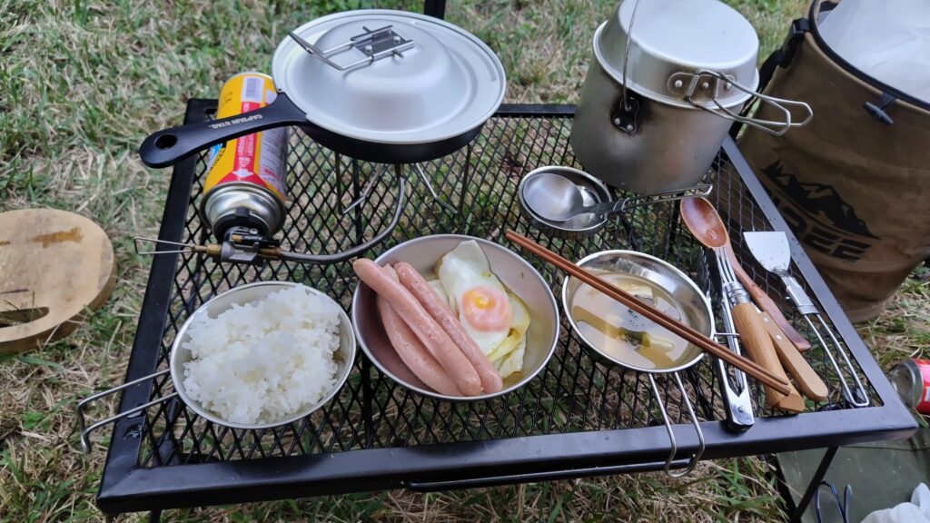 夜間何度か目を覚ますが、5時半まで幕内で過ごす。あたりが明るくなったところで、就寝前に車にしまっておいた食料、食器、ごみ箱を出して朝食の準備をする。