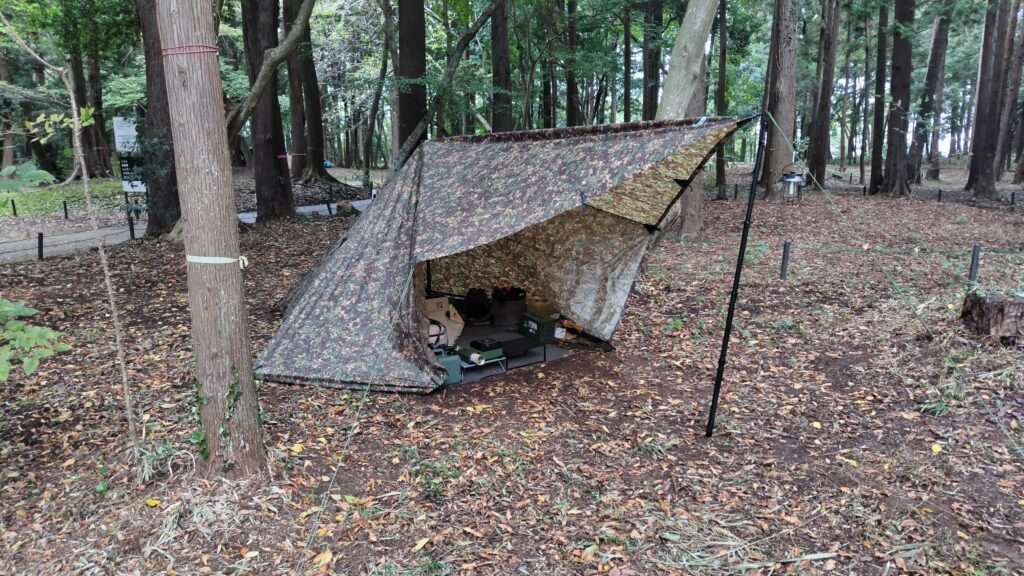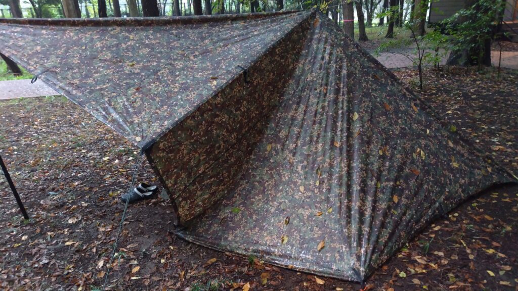 雨もだんだん強くなってきていたので奥へ進む気も起きず、前回同様駐車場から一番近い場所にDDタープ4×4をビークティピーで設営。早々に幕内へ引きこもります。