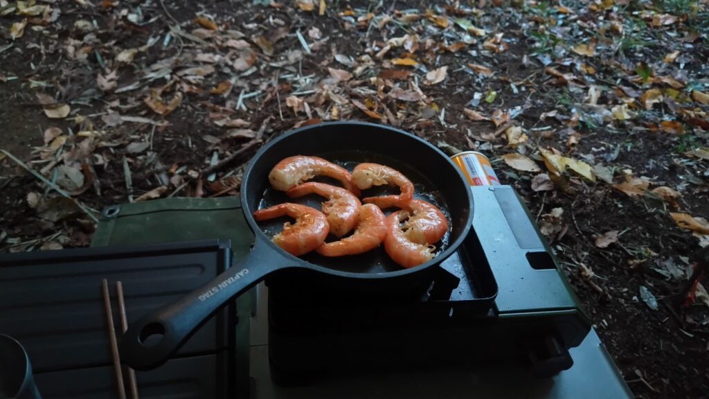 久しぶりに殻付き無頭のバナメイエビが買えたので、スキレットで炒めます。味付けはふー塩のみ。にんにくを切らしていました。