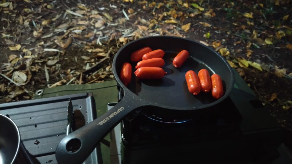赤ウインナーを炒める。これは火の通しが甘かった。少し焦がした方が美味しいかもしれない。
