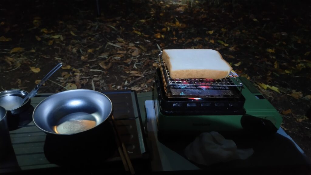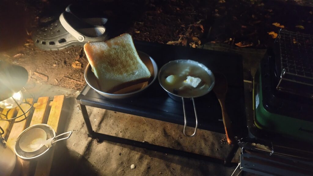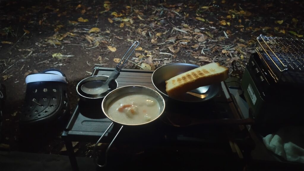 シチューと食パンで夕食。食後、庇からポールを外して半クローズ状態で幕内へ。だいぶ肌寒くなっていたので、夏用シュラフにフリースのインナーシュラフを仕込んで就寝。