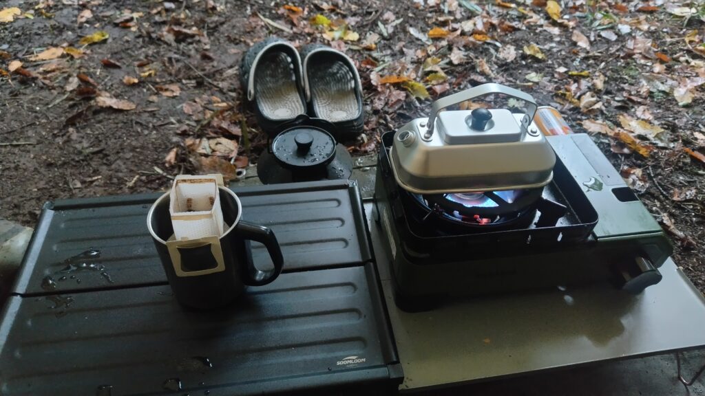 翌朝5時起床。夜中、かなり強い雨が降り地面をたたく水しぶきで幕内にも少し水が入ってきた。一応、浸水の可能性も考慮して設営を行ったので水没は免れましたが、幕の下ぎりぎりに置いていたものは少し砂が被った状態に。